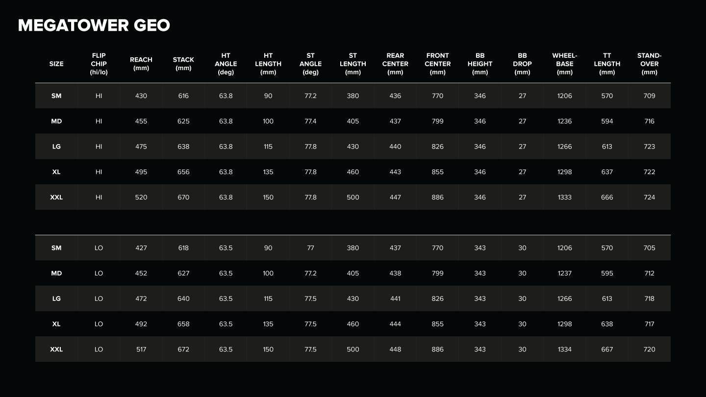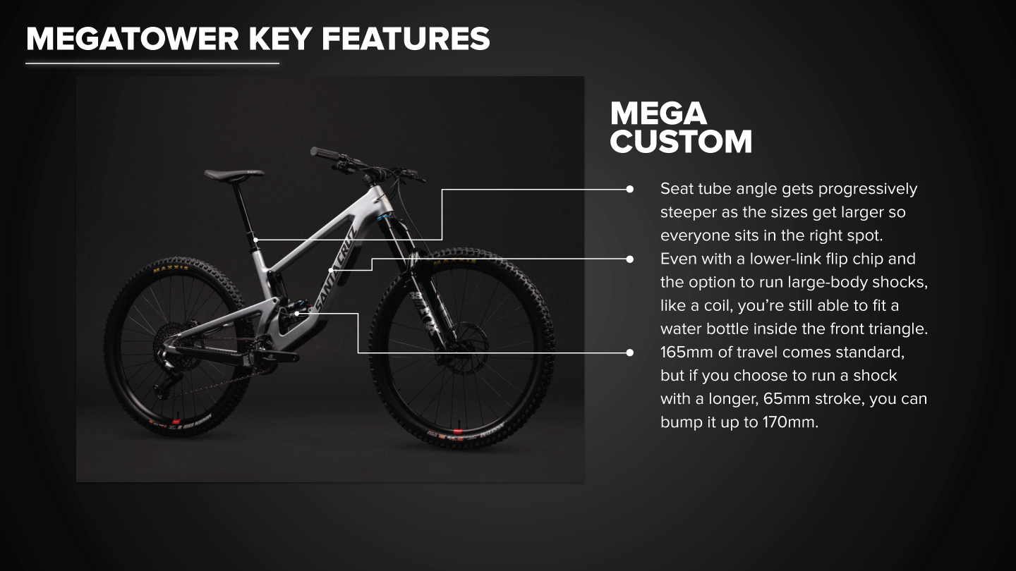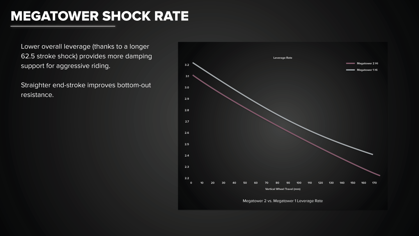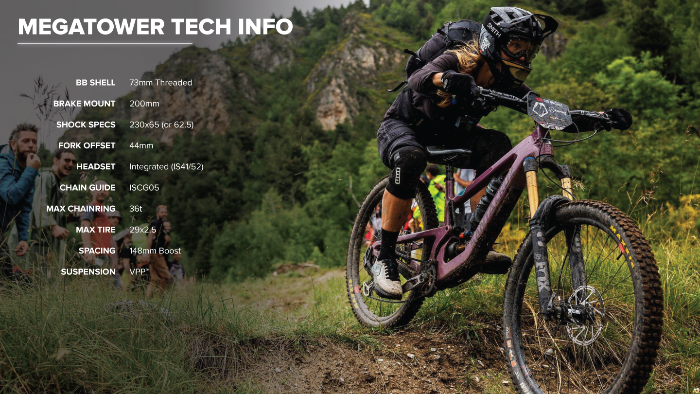 Megatower, bir downhill bisikletinin tırmanış konusunda gelebileceği en üst noktadır. Enduro için tasarlanmış olsa da, aslında tırmanabilen bir downhill bisikletine en yakın bisiklettir. 165/170mm VPP arka travel ve 170mm ön travel ile her iniş çocuk oyuncağı.